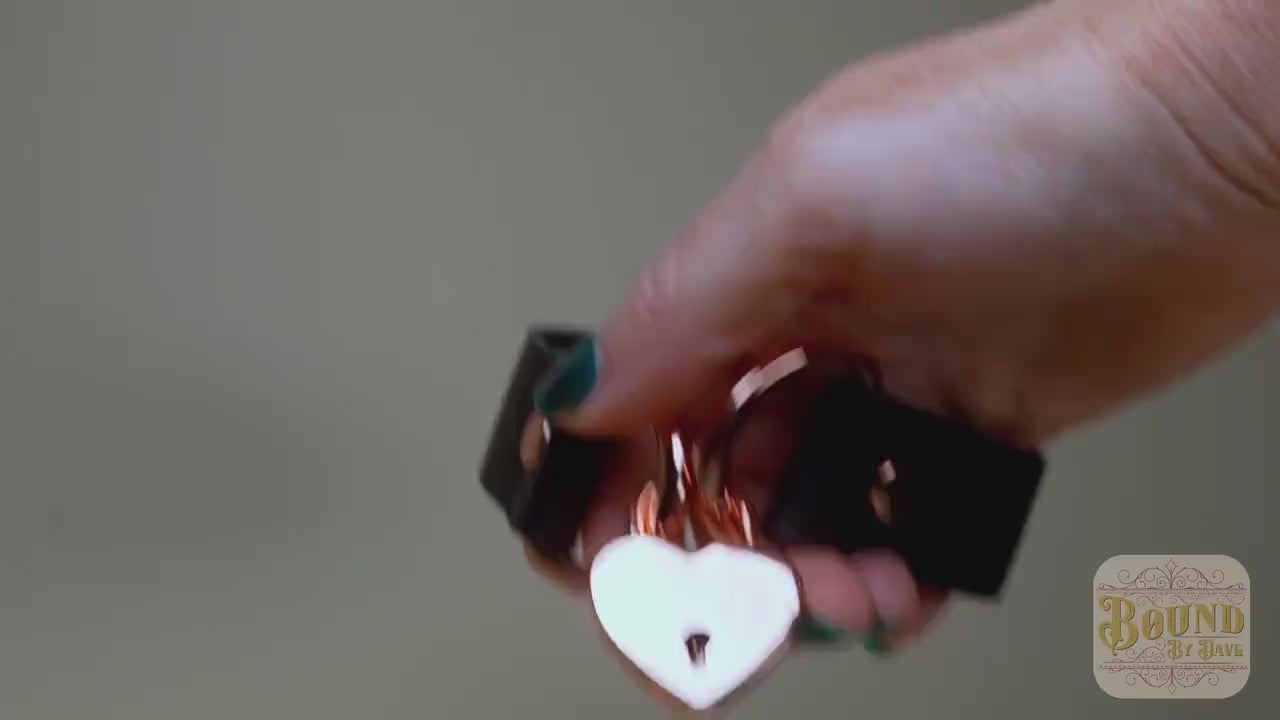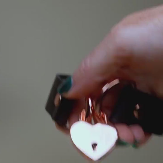 Materials: Full grain 5-6oz leather (black), rose gold (shiny copper color) SOLID brass rivets and large heart lock, including two matching keys.