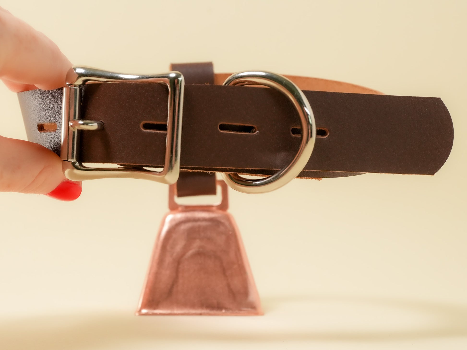 Materials: Full-grain brown buffalo leather, nickel-plated SOLID Brass Rivets, Locking Silver Buckle (Nickel), and Copper Cowbell. Dimensions: 12”–20” neck sizes, 1” wide leather strap, cowbell options 1”–3”+ tall.